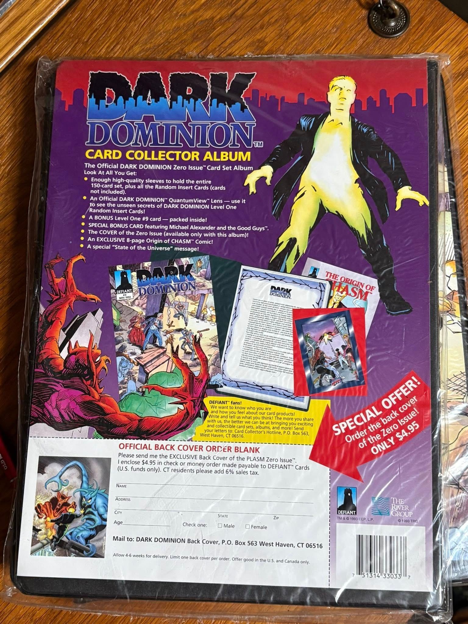 Vintage DARK DOMINION Card Collector Album from Defiant / The River Group (1993). This is the official “Dark Dominion Zero Issue” card set album/binder—still sealed.