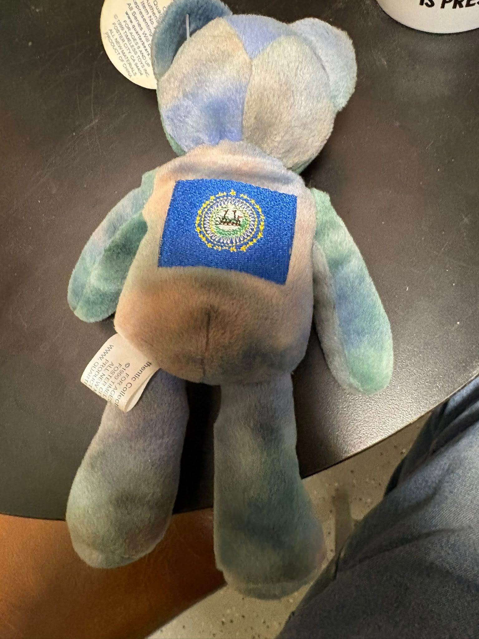 Cute NH souvenir teddy bear with New Hampshire & USA flag patches and “Collectible Quarter Bear” ear tag with quarter attached. Clean and in good condition. Great for collectors or NH-themed décor/gifts.