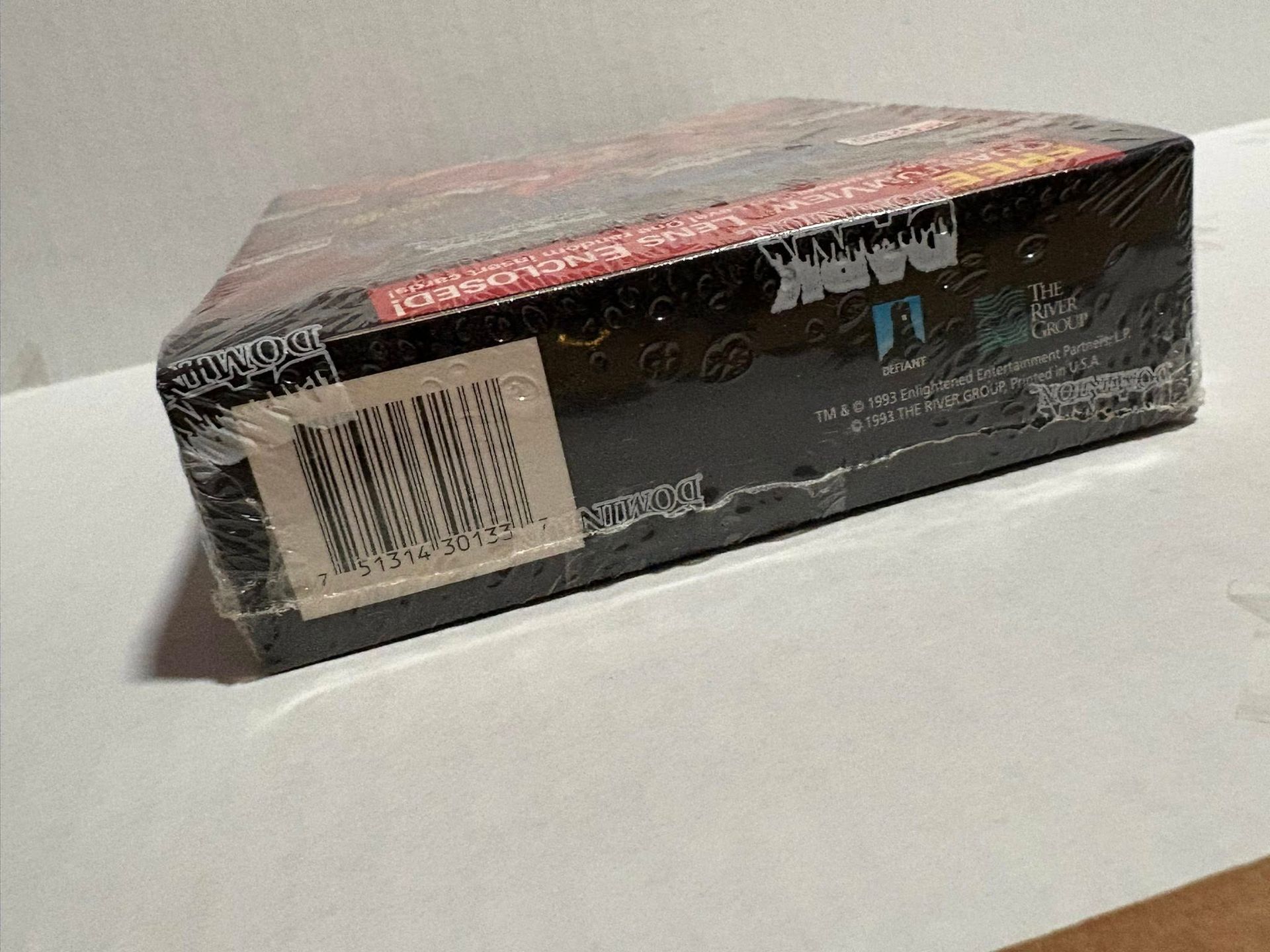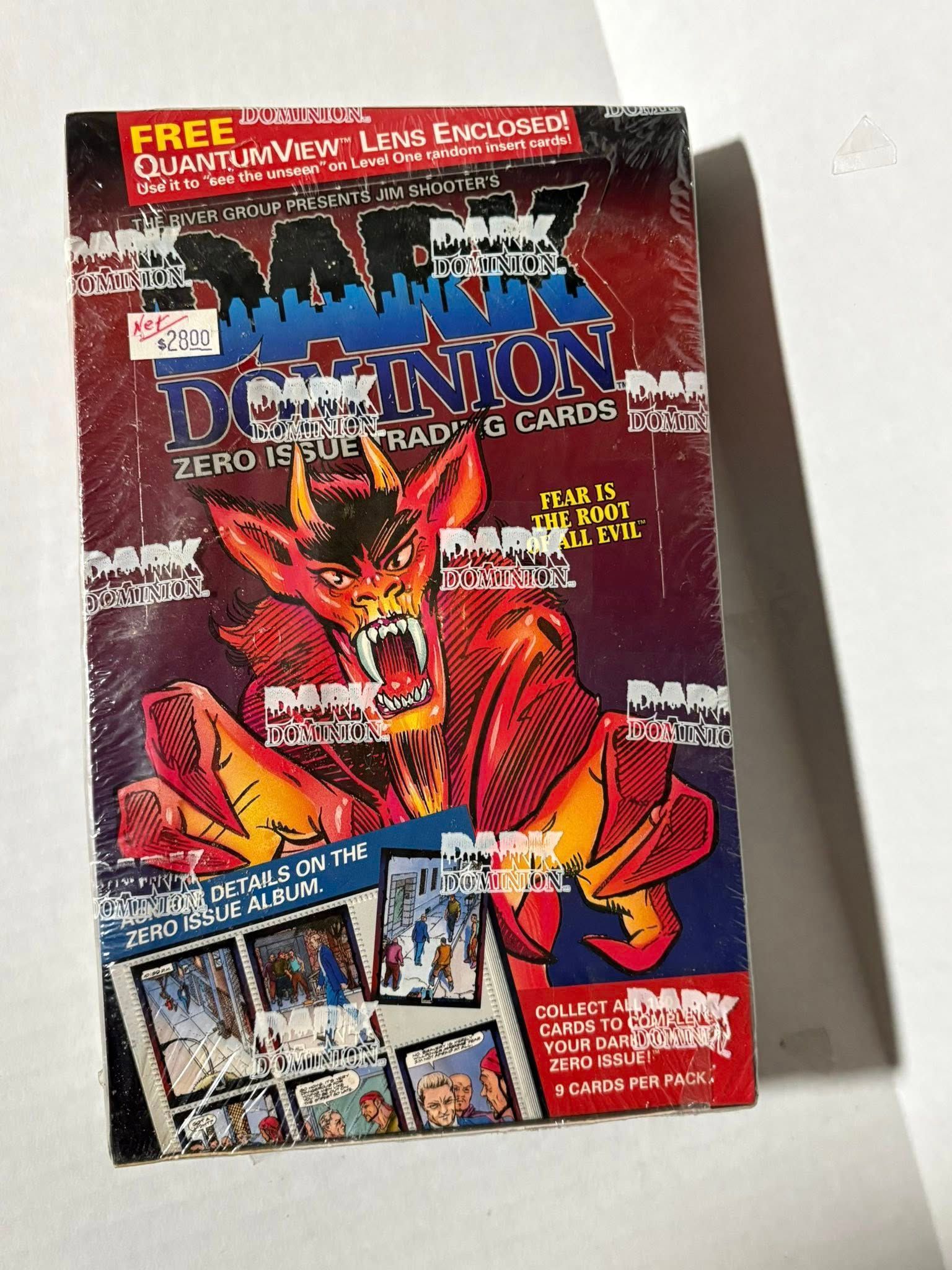 Vintage Dark Dominion: Zero Issue trading card booster box (1993) from The River Group / Defiant (Jim Shooter). Factory sealed in original shrink wrap.Details:• 36 packs per box• 9 cards per pack• “Bo Peep” box art variant (collectible box-bottom art set)• Promo on box: FREE QuantumView lens enclosed (per packaging)Condition: Sealed with normal storage/shelf wear to shrink wrap and corners (see photos).