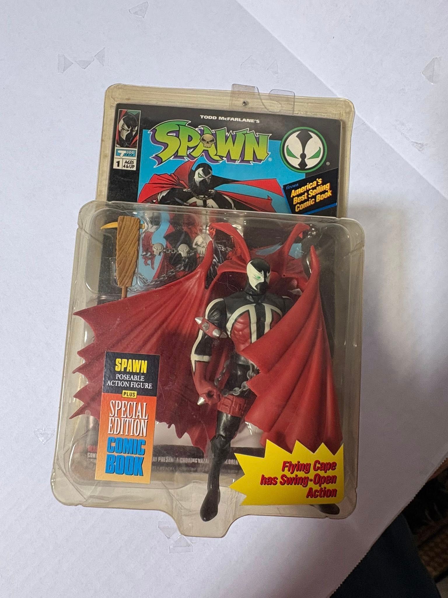 Original Todd McFarlane’s SPAWN poseable action figure (early release / Series 1 style) still sealed in the clamshell package. Package includes the “Special Edition Comic Book” (as indicated on the front). Collectible 90s figure—great for Spawn/McFarlane fans or display.