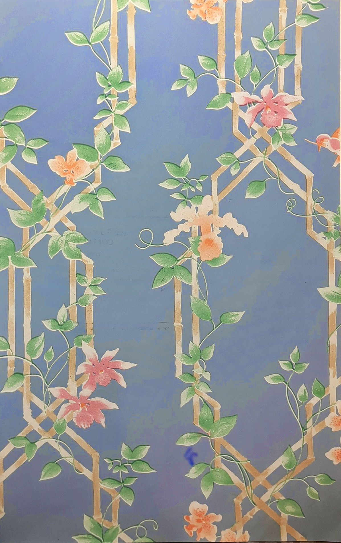 Pattern: Paradise Pattern No.: 839-T-178 Single roll size: 27" wide × 5 yards (pretrimmed) Pattern repeat: 18" Quantity: 4 single rolls total Approx. coverage: ~135 sq ft total Beautiful trellis + floral/vine design with a blue ground (see photos).