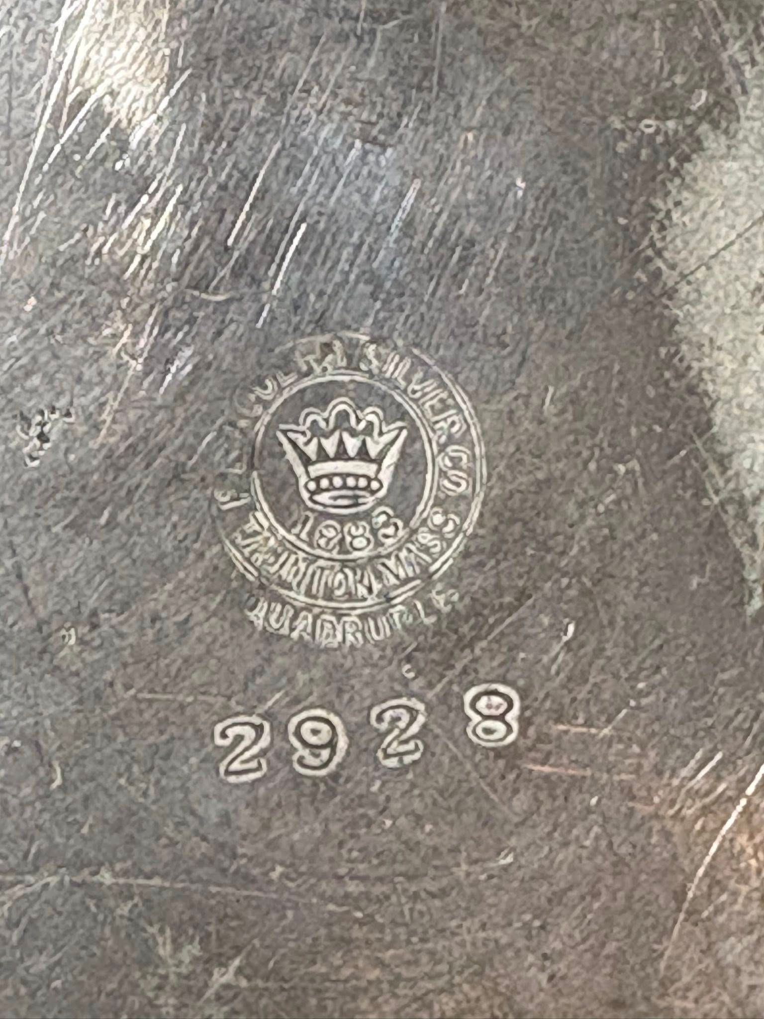 Nice vintage 6.5” serving plate with a classic beaded edge and beautiful old silver patina. Marked Quadruplet Silver Plate with maker’s stamp (see photos).